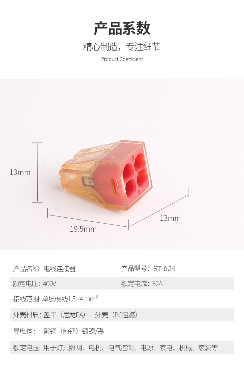 額定電流:400A額定電流:32A導線線徑:1.5-4mm²耐電壓:AC2500V/1Min機械性能環境溫度:-40°C~+105°C剝線長度:12mm尺寸:19.5*,9.2*,13.1材質及電鍍塑件:PC,UL94V-2彈片:不銹鋼觸點材料:電解銅鍍鎳錫