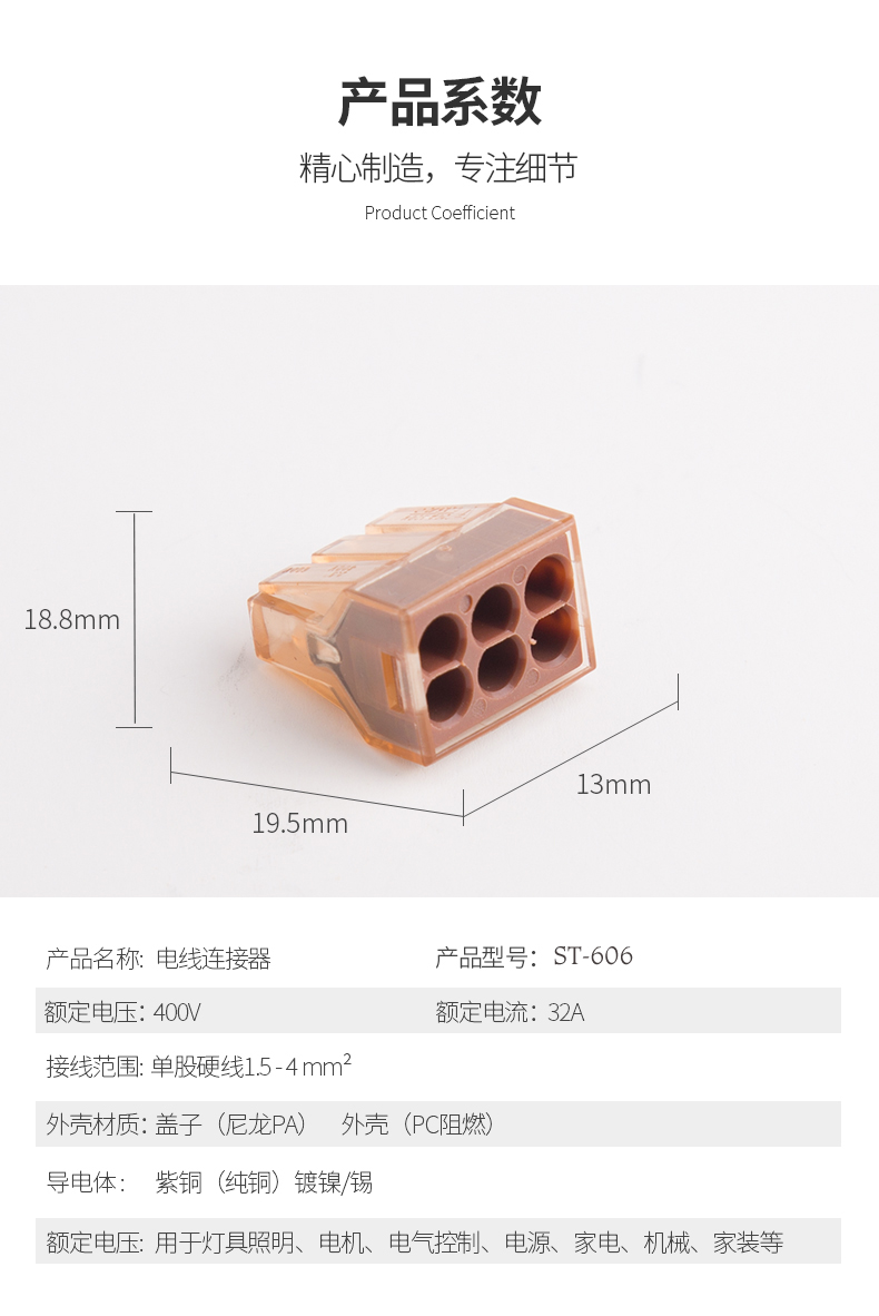 額定電流:400A額定電流:32A導線線徑:1.5-4mm²耐電壓:AC2500V/1Min機械性能環境溫度:-40°C~+105°C剝線長度:12mm尺寸:19.5*,9.2*,13.1材質及電鍍塑件:PC,UL94V-2彈片:不銹鋼觸點材料:電解銅鍍鎳錫